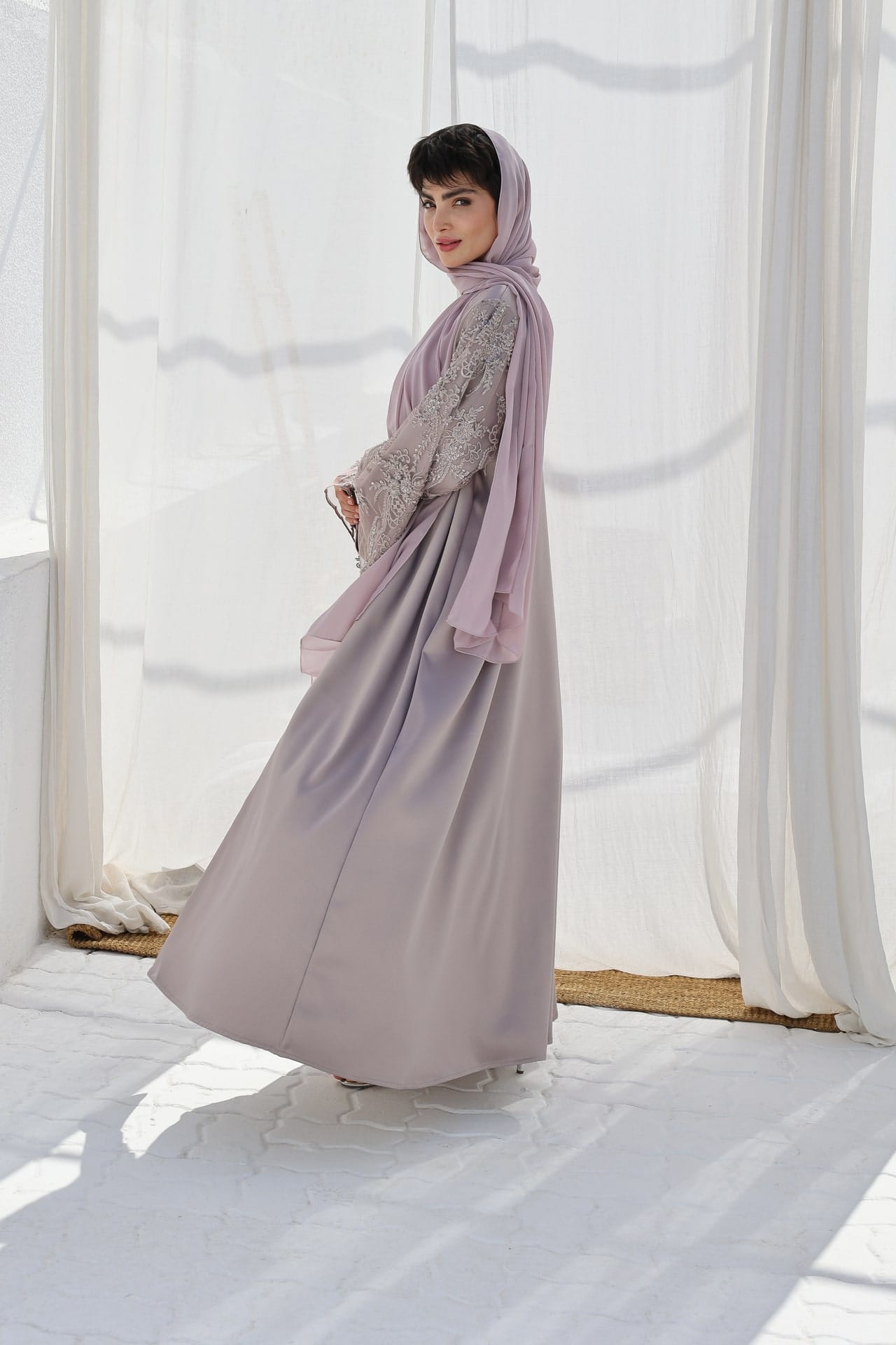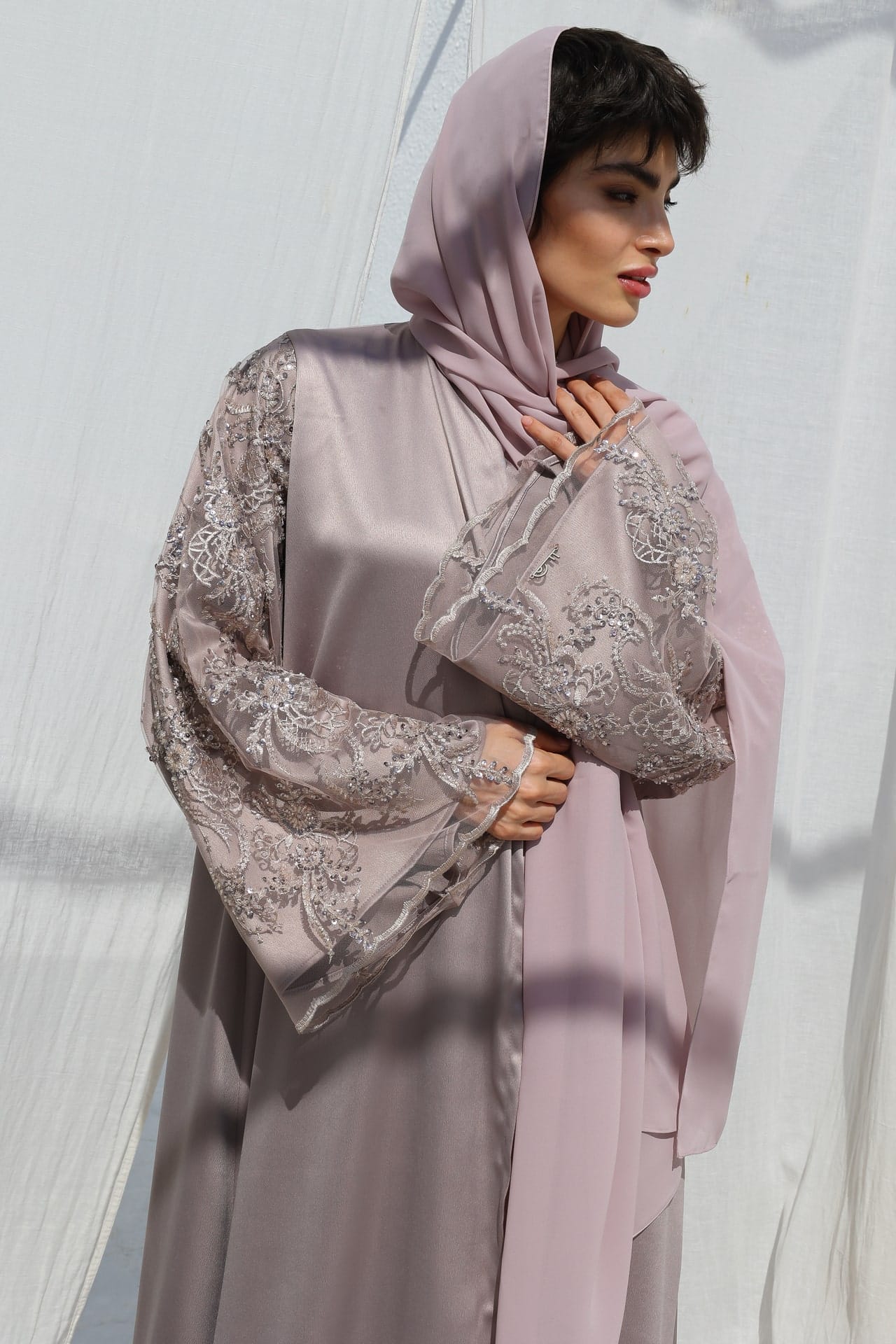 Diese Abaya besticht durch ihren weichen, schimmernden Stoff, der jedem Anlass eine edle Note verleiht. Die Ärmel aus feiner Spitze, liebevoll mit kleinen Perlen verziert, spiegeln eine ruhige Eleganz wider und machen diese Abaya zu etwas ganz Besonderem. Ein zukünftiges Lieblingsstück, das schlicht und doch außergewöhnlich wirkt.